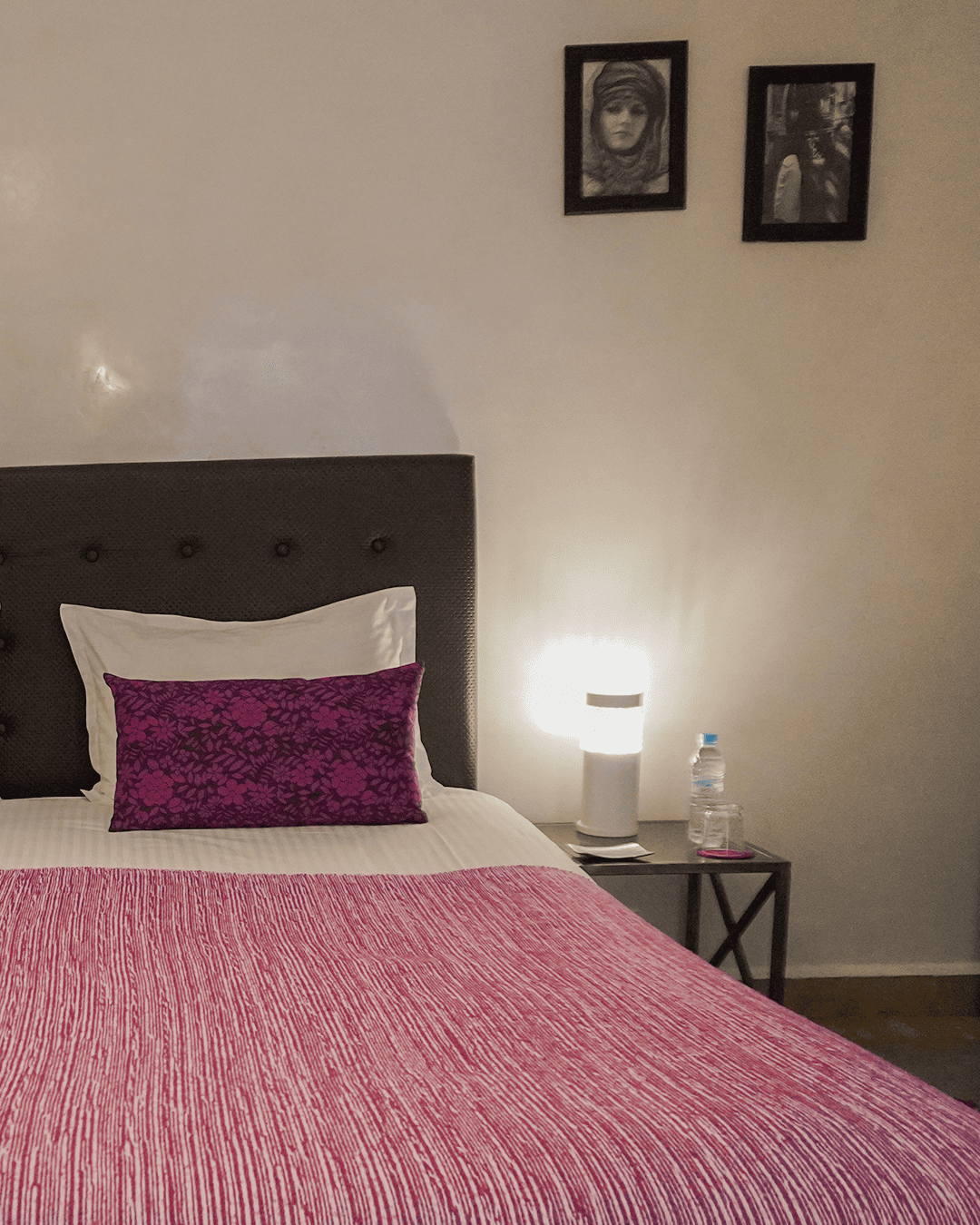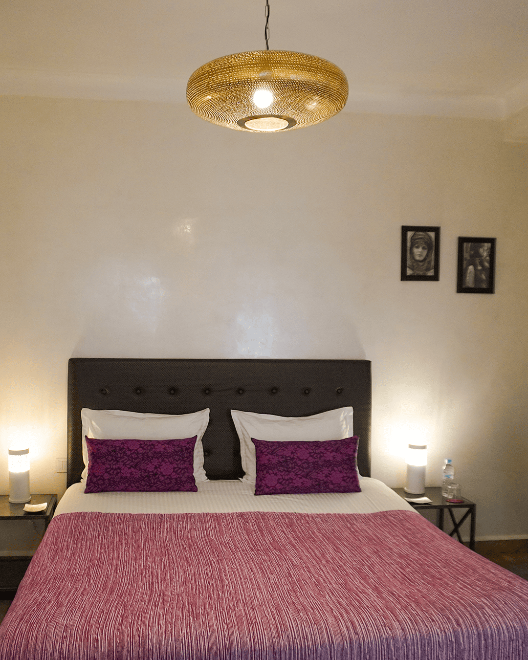 La chambre Figuier, la soeur jumelle de l’Oranger juste un étage au dessus est décorée dans les tons mauve comme le fruit, le style contemporain des fauteuils et celui marocain de la commode apporte le luxe et le confort que nous voulions donner à nos chambres. La Figue est un aliment millénaire protecteur de votre santé. Sa richesse en fibres contribue à la prévention de nombreuses affections. L’ambiance de la Chambre Figuier vous invite à la sérénité.