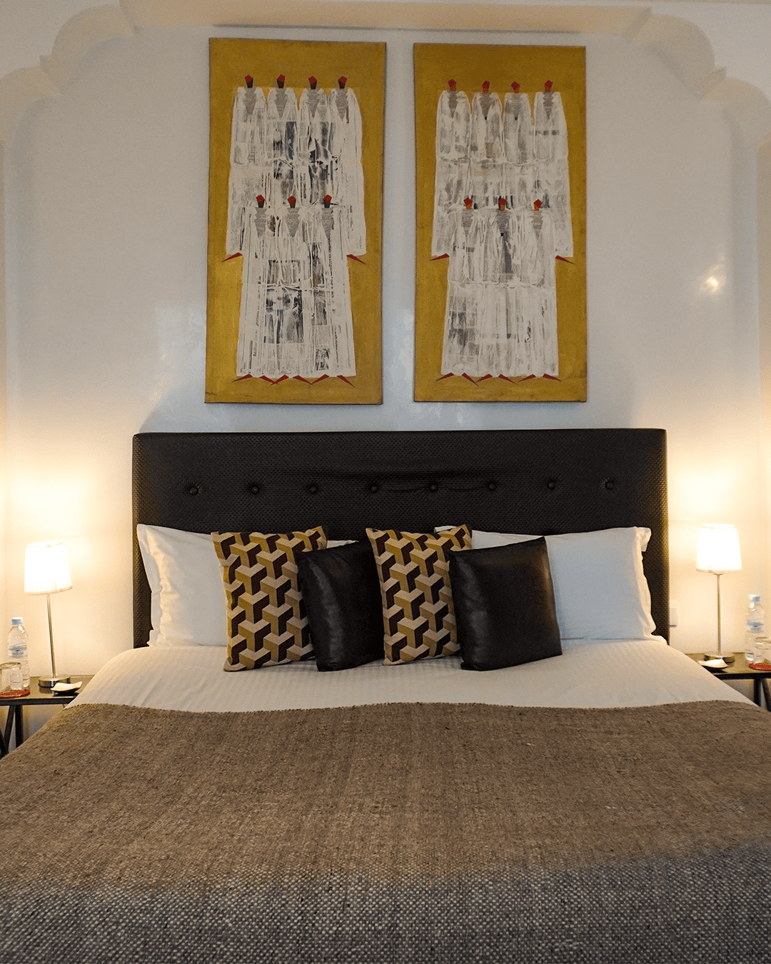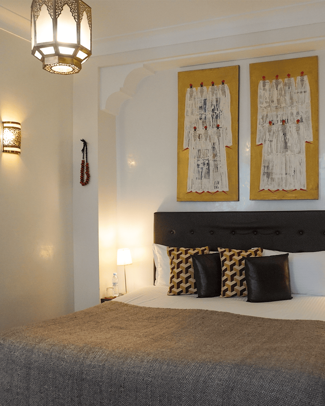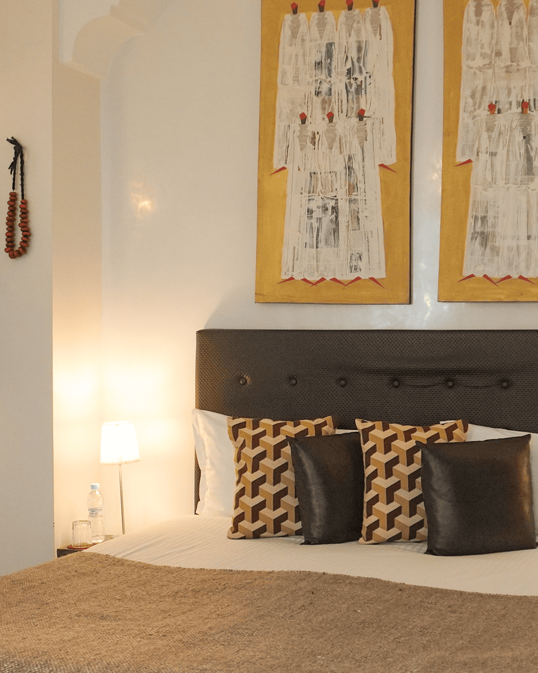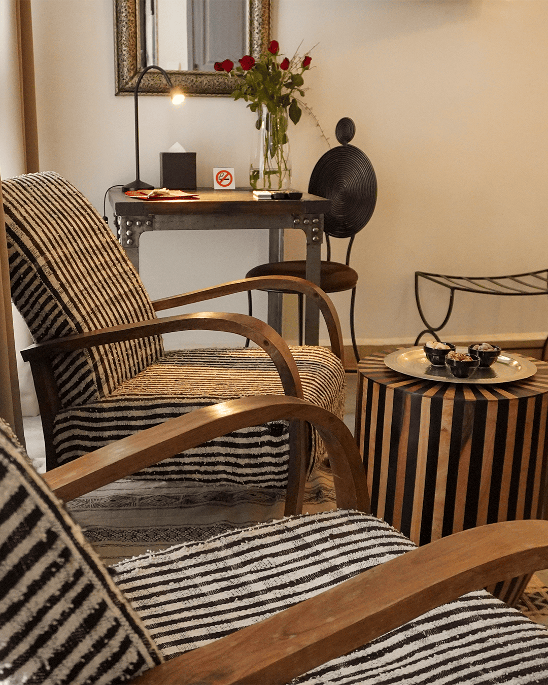 La suite Palmier, au 1er étage, luxueuse de par sa taille, sa décoration et son mobilier. Très lumineuse, elle offre une belle vue sur le patio et le grand palmier qui est à portée de mains.Elle est dotée d’une literie de luxe de 1,80 m.